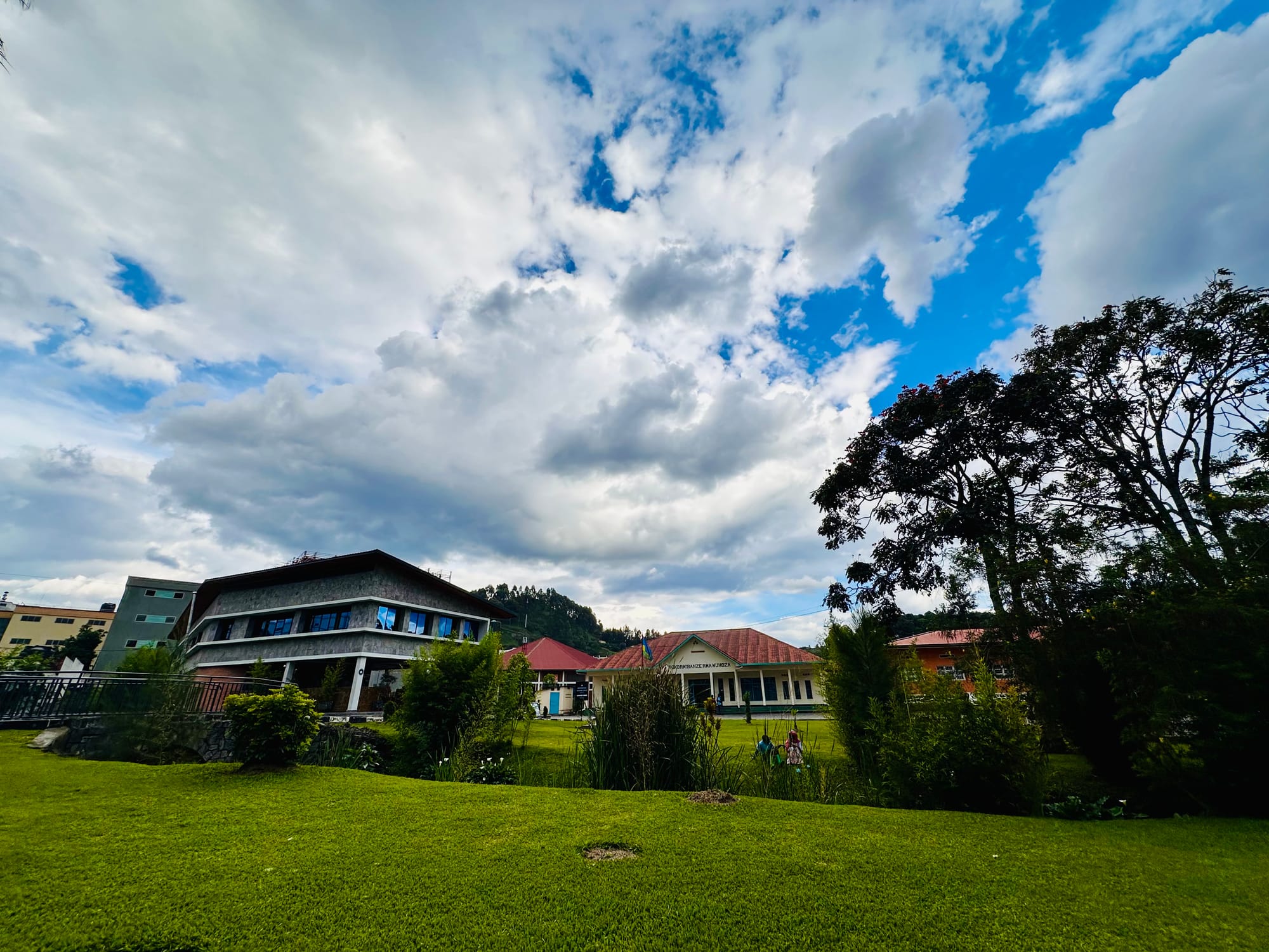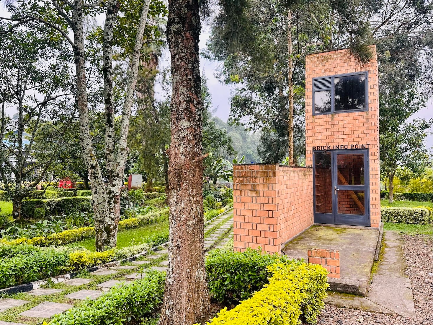 Entering the compound is an experience in itself. You step into greenery and long trees, with a narrow stream of clear water running through, feeding into the Kigombe stream that runs across downtown Musanze. Just at the entrance, on the right, there is a small brick structure — almost like a lookout point — set within a border of trimmed low hedge. It is easy to miss if you walk in distracted, but once you notice it, it begins to feel deliberate, as if marking the threshold between the street and what lies inside.