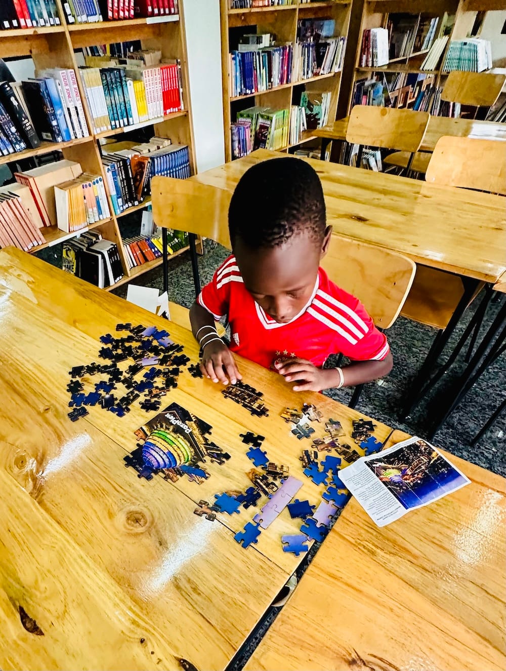 Bookshelves and a young person trying to solve a puzzle at Agati Library.
